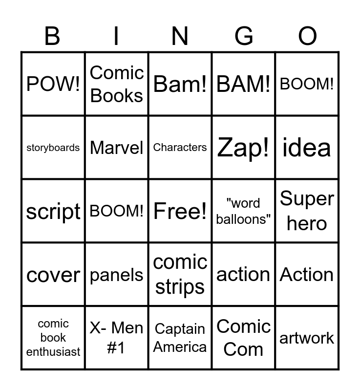 This bingo card has a free space and 29 words: comic book enthusiast, cartoonist, BOOM!, stories, POW!, Bam!, Marvel, panels, "word balloons", X- Men #1, Super hero, artwork, Captain America, Comic Com, idea, bubbles, comic strips, cover, BOOM!, script, action, projects, Zap!, storyboards, BAM!, Comic Books, Action, Characters and Comic Stripe.