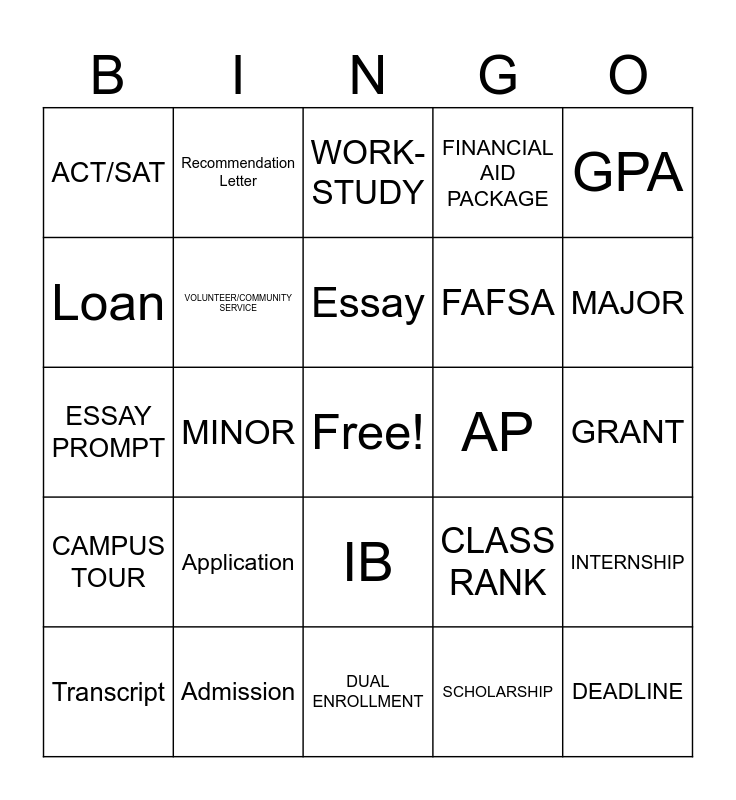 This bingo card has a free space and 24 words: Application, Admission, Essay, Transcript, GPA, ACT/SAT, Loan, Recommendation Letter, AP, IB, FAFSA, ESSAY PROMPT, CLASS RANK, INTERNSHIP, VOLUNTEER/COMMUNITY SERVICE, SCHOLARSHIP, GRANT, WORK-STUDY, MAJOR, MINOR, DEADLINE, CAMPUS TOUR, FINANCIAL AID PACKAGE and DUAL ENROLLMENT.