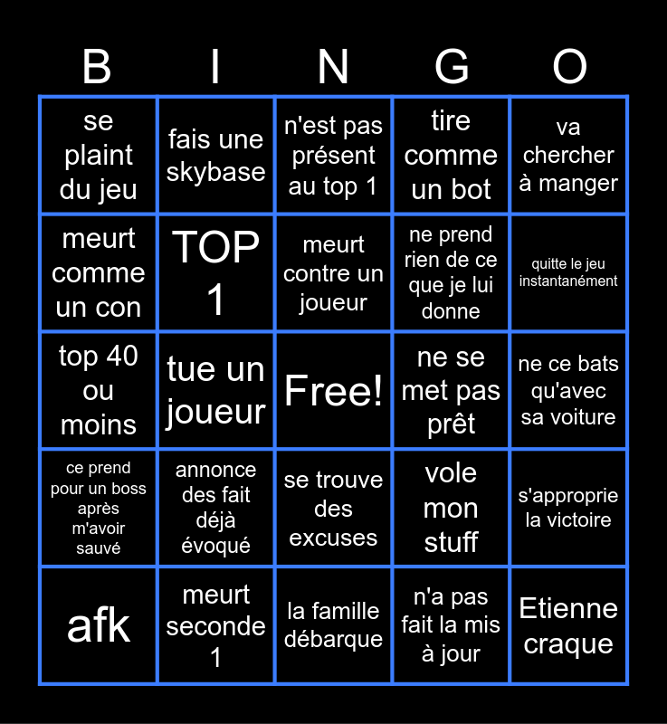 This bingo card has a free space and 64 words: possède 30 fois la même arme, atterrit seul, ce vente de tuer un bot, s'approprie la victoire, ne prend jamais de shield, passe sa vie dans un véhicule, fais une skybase, camp, meurt contre un joueur, m'empêche de boire mon shield, se trouve des excuses, utilise la pire arme pour la pire situation, ne ce bats qu'avec sa voiture, va chercher à manger, se suicide, meurt comme un con, tue un joueur, se plaint du jeu, fait des bruits de bouches, ne prend rien de ce que je lui donne, annonce des fait déjà évoqué, ce prend pour un boss après m'avoir sauvé, tire comme un bot, meurt après être secouru, se fait tuer à l'autre bout du monde, regarde une vidéo, possède des bruits de fond, discussion random, arrive après la fête, construit comme un bot, pose un rampe au lieu d'un mur, meurt au vanne, doit me sauver, me fait m'arracher les yeux avec son gameplay, quitte le jeu instantanément, afk, n'a pas fait ces devoir, n'a pas fait la mis à jour, game perdu d'avance, TOP 1, top 40 ou moins, ne se met pas prêt, dance du bambi, loupe un free kil, no more permis, Etienne craque, meurt seconde 1, meurt +3 fois, vole mon stuff, se rend pas compte qu'il est vivant, sauvé par Etienne, rush tout seul et meurt comme une merde, la famille débarque, Etienne fait +20 kills, Théo fait +4 kills, se met devant mon viseur, n'est pas présent au top 1, mis k.o., Théo a survécu, soundboard, ramasse miette, meurt dans la zone, decède juste avant que le reà and explose la station essence.