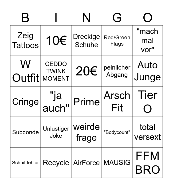 This bingo card has a free space and 24 words: Unlustiger Joke, Recycle, 20€, Schnittfehler, "mach mal vor", Zeig Tattoos, W Outfit, 10€, Arsch Fit, weirde frage, peinlicher Abgang, Cringe, "Bodycount", total versext, CEDDO TWINK MOMENT, MAUSIG, Tier O, Dreckige Schuhe, Auto Junge, "ja auch", FFM BRO, Subdonde, Red/Green Flags and AirForce.
