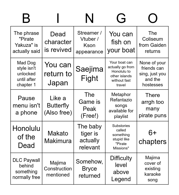This bingo card has a free space and 24 words: Makato Makimura, Majima Construction mentioned, Saejima Fight, DLC Paywall behind something normally free, The Coliseum from Gaiden returns, The phrase "Pirate Yakuza" is actually said, Mad Dog style isn't unlocked until after chapter 1, Dead character is revived, Metaphor Refantazio songs available for playlist, The baby tiger is actually relevant, Your boat can actually go from Honolulu to other islands without fast travel, Pause menu isn't a phone, Substories called something stupid like "Pirate Missions", 6+ chapters, You can return to Japan, Difficulty level above Legend, There arrgh too many pirate puns, Streamer / Vtuber / Kson appearance, None of your friends can sing, just you and the hostesses, Like a Butterfly (Also free), Majima cover of existing karaoke song, Honolulu of the Dead, You can fish on your boat and Somehow, Bryce returned.
