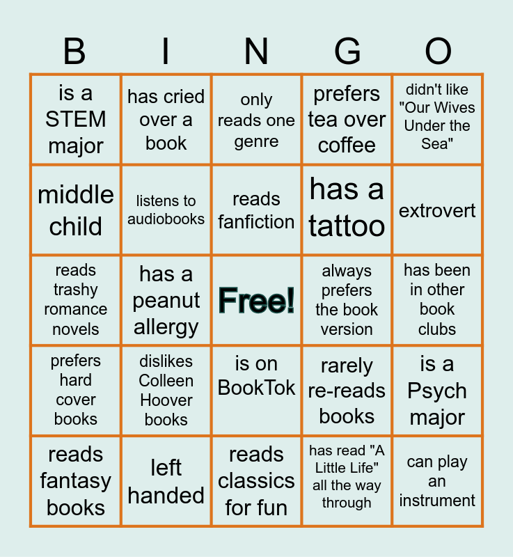 This bingo card has a free space and 34 words: is a morning person, has read "A Little Life" all the way through, studied abroad, on a sports team at Tufts, prefers hard cover books, listens to audiobooks, didn't like "Our Wives Under the Sea", reads fantasy books, has cried over a book, annotates or dogears books, reads fanfiction, only reads one genre, has a Goodreads account, never DNF's a book, always prefers the book version, extrovert, left handed, reads trashy romance novels, dislikes Colleen Hoover books, rarely re-reads books, is on BookTok, has met an author IRL, is a STEM major, has been in other book clubs, reads classics for fun, can play an instrument, prefers tea over coffee, has run a marathon, has a tattoo, middle child, gets 8+ hours of sleep every night, has a peanut allergy, is a Psych major and prefers Percy Jackson over Harry Potter.