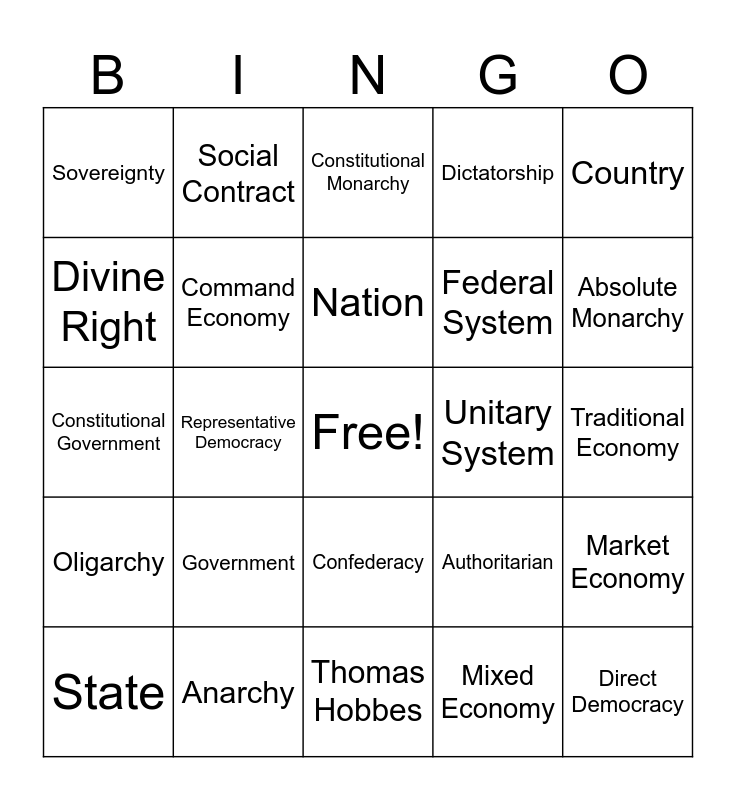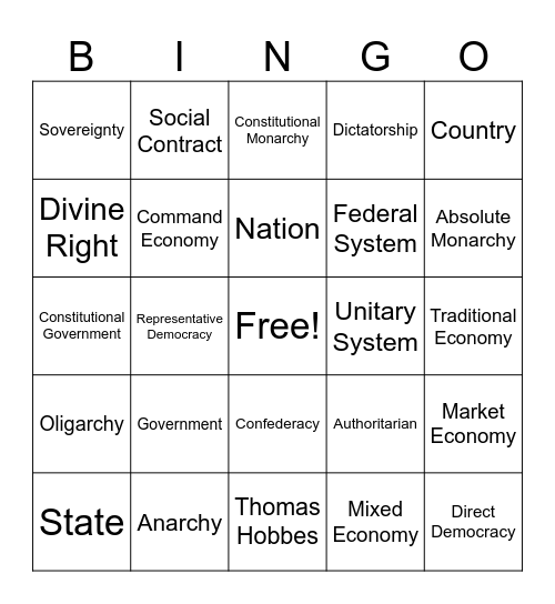 This bingo card has a free space and 24 words: Government, Anarchy, Nation, State, Country, Sovereignty, Divine Right, Social Contract, Unitary System, Confederacy, Federal System, Constitutional Government, Authoritarian, Market Economy, Command Economy, Mixed Economy, Traditional Economy, Constitutional Monarchy, Absolute Monarchy, Representative Democracy, Direct Democracy, Oligarchy, Dictatorship and Thomas Hobbes.