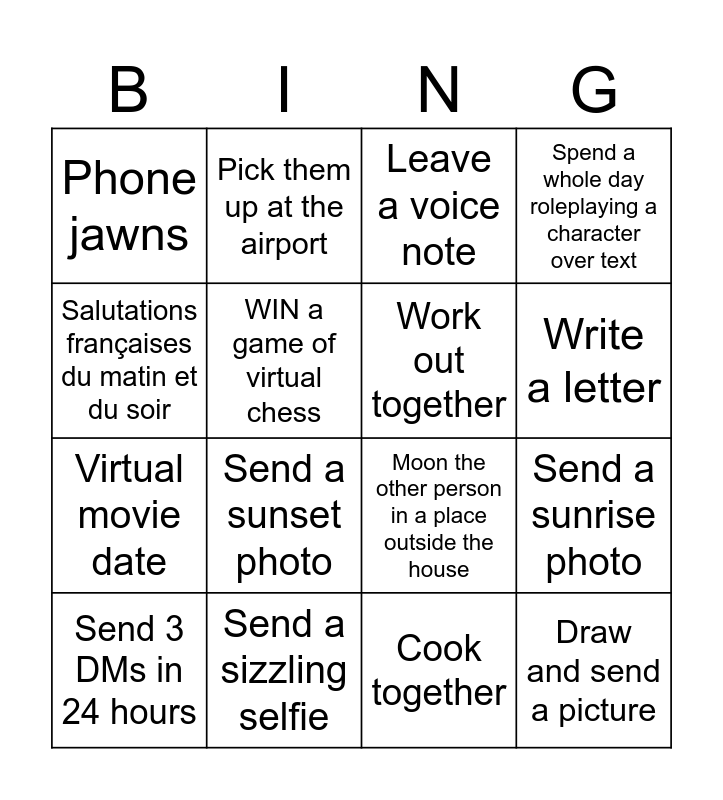 This bingo card has 16 words: Send a sizzling selfie, Send a sunrise photo, Leave a voice note, Phone jawns, Virtual movie date, Pick them up at the airport, Moon the other person in a place outside the house, Cook together, Salutations françaises du matin et du soir, WIN a game of virtual chess, Send 3 DMs in 24 hours, Spend a whole day roleplaying a character over text, Send a sunset photo, Write a letter, Work out together and Draw and send a picture.