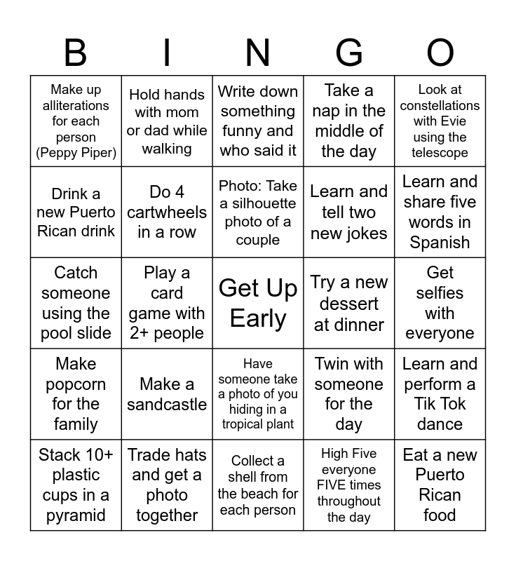 This bingo card has a free space and 29 words: Stack 10+ plastic cups in a pyramid, Help set and clean up the table, Play a card game with 2+ people, Write something in the sand, Make up alliterations for each person (Peppy Piper), Write down something funny and who said it, Do 4 cartwheels in a row, Make a sandcastle, Try a new dessert at dinner, Trade hats and get a photo together, Get selfies with everyone, Eat a new Puerto Rican food, Collect a shell from the beach for each person, High Five everyone FIVE times throughout the day, Learn and share five words in Spanish, Pose like super heroes with Evie, Have someone take a photo of you hiding in a tropical plant, Make popcorn for the family, Look at constellations with Evie using the telescope, Catch someone using the pool slide, Twin with someone for the day, Pick a movie for movie night, Learn and tell two new jokes, Drink a new Puerto Rican drink, Take a nap in the middle of the day, Hold hands with mom or dad while walking, Learn and perform a Tik Tok dance, Photo: Take a silhouette photo of a couple and Catch FIVE people in the pool at the same time.