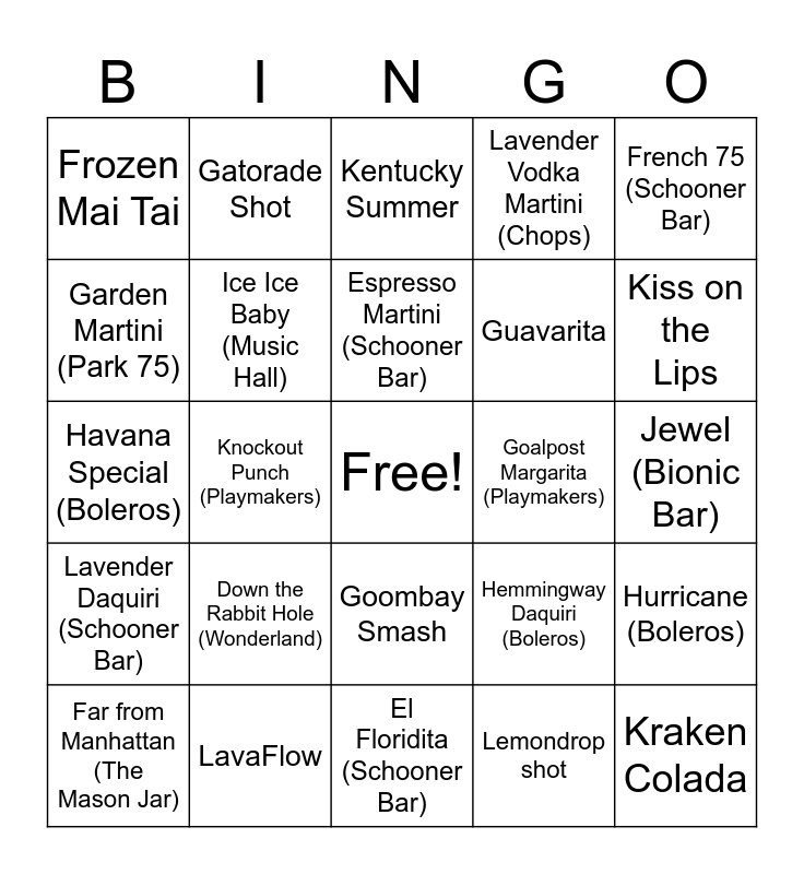 This bingo card has a free space and 25 words: Down the Rabbit Hole (Wonderland), El Floridita (Schooner Bar), Espresso Martini (Schooner Bar), Far from Manhattan (The Mason Jar), French 75 (Schooner Bar), Frozen Mai Tai, Garden Martini (Park 75), Gatorade Shot, Goalpost Margarita (Playmakers), Goombay Smash, Guavarita, Havana Special (Boleros), Hemmingway Daquiri (Boleros), Hurricane (Boleros), Ice Ice Baby (Music Hall), John Collins (Schooner Bar), Jewel (Bionic Bar), Kentucky Summer, Kiss on the Lips, Knockout Punch (Playmakers), Kraken Colada, LavaFlow, Lavender Daquiri (Schooner Bar), Lavender Vodka Martini (Chops) and Lemondrop shot.