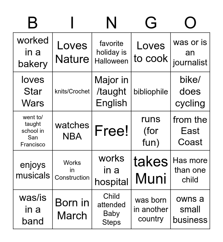 This bingo card has a free space and 24 words: Works in Construction, Born in March, Major in /taught English, was/is in a band, was or is an journalist, worked in a bakery, loves Star Wars, Loves Nature, runs (for fun), works in a hospital, bibliophile, went to/ taught school in San Francisco, takes Muni, Has more than one child, knits/Crochet, was born in another country, from the East Coast, favorite holiday is Halloween, bike/ does cycling, watches NBA, owns a small business, enjoys musicals, Loves to cook and Child attended Baby Steps.
