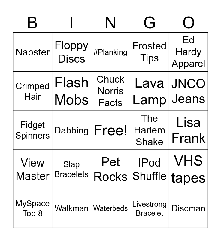 This bingo card has a free space and 75 words: 1337 5p34k (Leet Speak), #MannequinChallenge, #Planking, #IceBucketChallenge, AOL Chat Rooms, Ask Jeeves, Atari, Betamax, Blockbuster, Boom Box, Cabbage Patch Kids, Caboodles, Chuck Norris Facts, Crimped Hair, Crystal Pepsi, Dabbing, Dance Dance Revolution, Discman, DIGIMON, Ed Hardy Apparel, Epic Fail, Fidget Spinners, Flash Mobs, Floppy Discs, Frosted Tips, Furby, Gameboy Color, Gangnam Style, Garbage Pail Kids, Hammer Dance, Heelies, Hyper Color T-Shirts, Inflatable Furniture, IPod Shuffle, JNCO Jeans, Lava Lamp, Leg Warmer, LimeWire, Lisa Frank, Livestrong Bracelet, MC Hammer Pants/Parachute Pants, MiniClips, Moon Boots, Motorola Razr, MTV Videos, My Little Pony, MySpace Top 8, Napster, Neopets, Nickelodeon Slime!, Pac Man, Pet Rocks, Pogs, Pong, Pop Up Video, Puka Shell Necklaces, Rainbow Brite, ScratchNSniff Stickers, SillyBandz, Skip-It, Slap Bracelets, Stretch Armstrong, Tamagotchi, Tang, The Carlton Dance, The Harlem Shake, Trapper Keeper, TRIPP Pants (Hot Topic), Trolls, VHS tapes, View Master, Walkman, Wallet Chains, Waterbeds and YOLO.