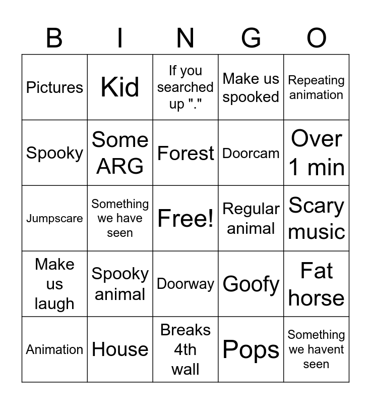 This bingo card has a free space and 24 words: Spooky animal, House, Forest, Animation, Repeating animation, Pictures, Spooky, Kid, Regular animal, Doorway, Doorcam, Jumpscare, Goofy, Fat horse, Some ARG, Pops, Scary music, If you searched up ".", Over 1 min, Something we have seen, Something we havent seen, Make us laugh, Make us spooked and Breaks 4th wall.