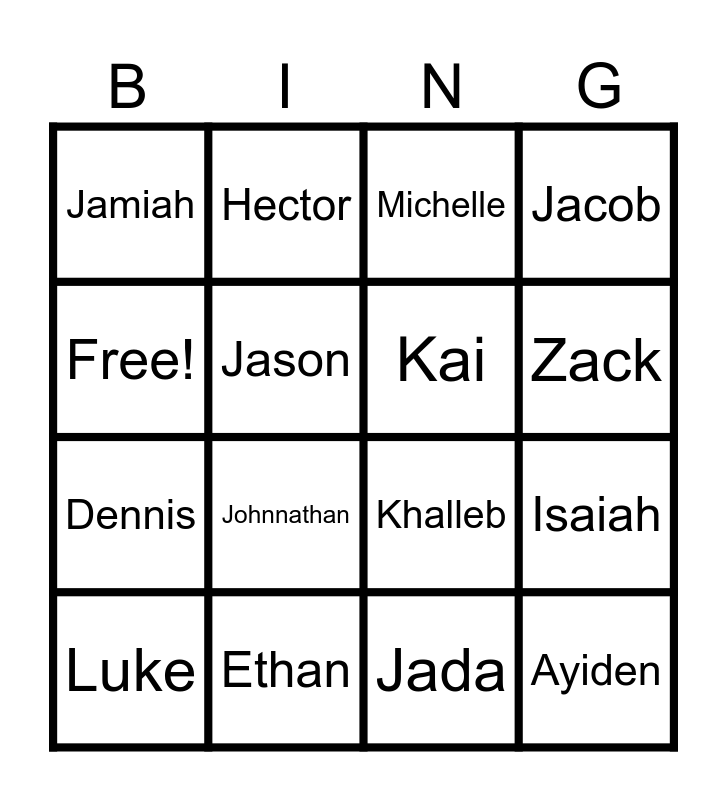 This bingo card has 16 words: Ethan, Isaiah, Michelle, Jamiah, Dennis, Hector, Khalleb, Jada, Free!, Jason, Luke, Jacob, Johnnathan, Zack, Kai and Ayiden.