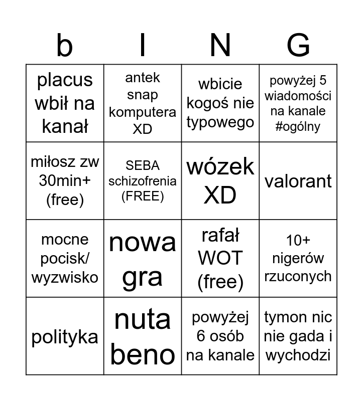 This bingo card has 16 words: nuta beno, 10+ nigerów rzuconych, wbicie kogoś nie typowego, placus wbił na kanał, mocne pocisk/ wyzwisko, antek snap komputera XD, rafał WOT (free), powyżej 6 osób na kanale, miłosz zw 30min+ (free), SEBA schizofrenia (FREE), polityka, powyżej 5 wiadomości na kanale #ogólny, nowa gra, valorant, wózek XD and tymon nic nie gada i wychodzi.