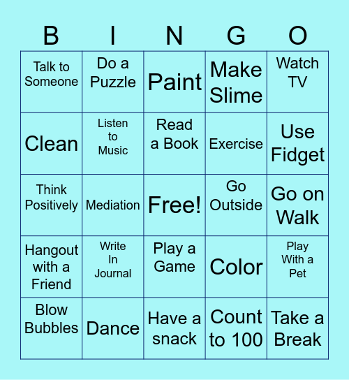 This bingo card has a free space and 24 words: Write In Journal, Dance, Read a Book, Blow Bubbles, Watch TV, Talk to Someone, Clean, Do a Puzzle, Go Outside, Play a Game, Exercise, Think Positively, Color, Play With a Pet, Listen to Music, Count to 100, Go on Walk, Paint, Use Fidget, Mediation, Take a Break, Hangout with a Friend, Make Slime and Have a snack.