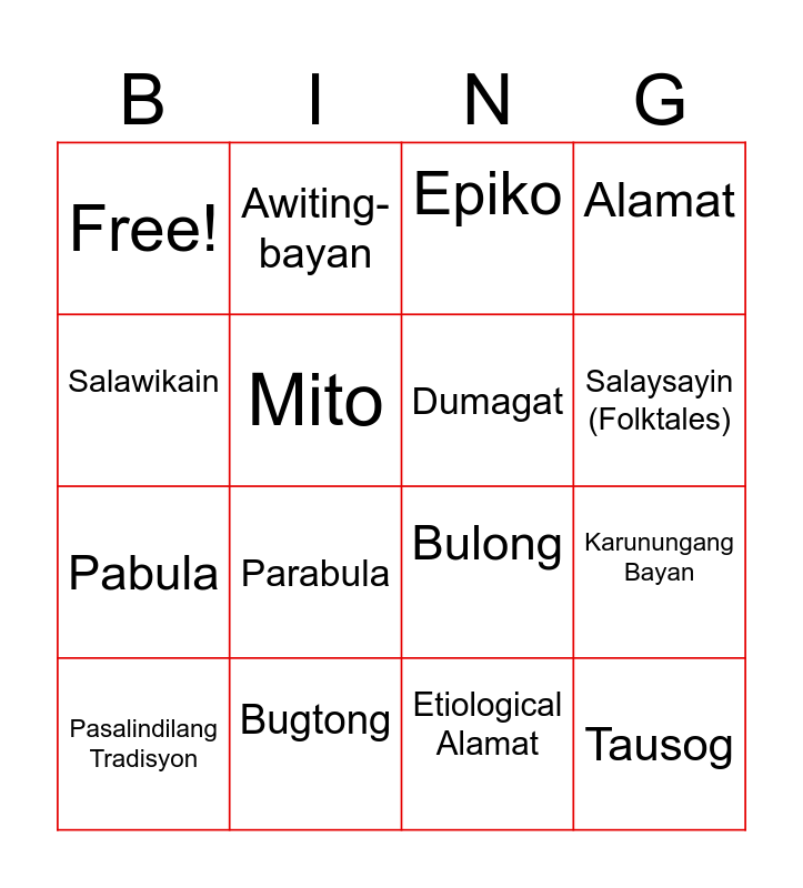 This bingo card has 16 words: Pasalindilang Tradisyon, Bugtong, Epiko, Alamat, Salawikain, Awiting-bayan, Bulong, Karunungang Bayan, Free!, Mito, Etiological Alamat, Salaysayin (Folktales), Pabula, Parabula, Dumagat and Tausog.