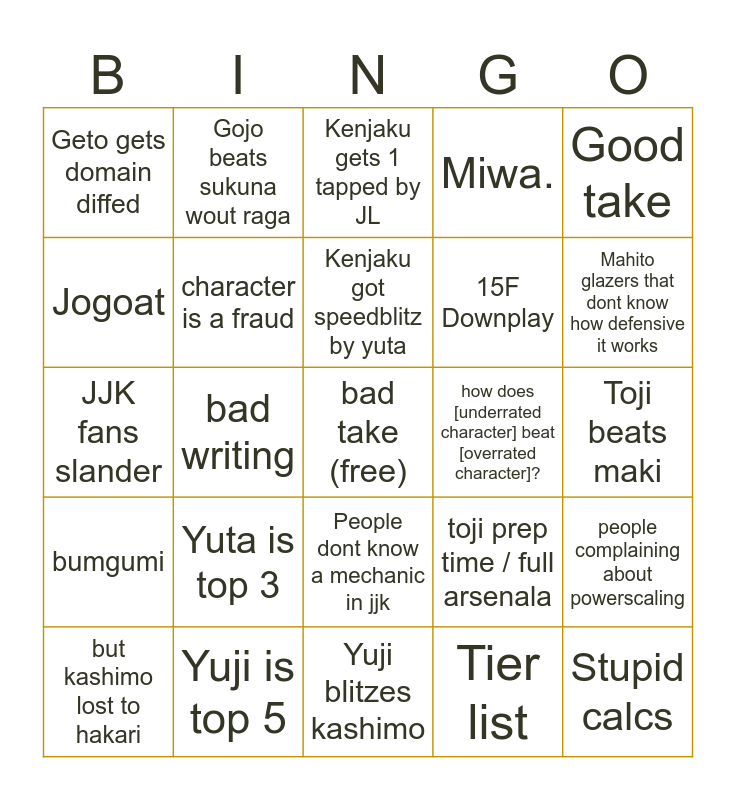This bingo card has a free space and 24 words: Yuta is top 3, Yuji is top 5, Kenjaku got speedblitz by yuta, but kashimo lost to hakari, Good take, Geto gets domain diffed, Jogoat, Gojo beats sukuna wout raga, how does [underrated character] beat [overrated character]?, People dont know a mechanic in jjk, 15F Downplay, JJK fans slander, toji prep time / full arsenala, people complaining about powerscaling, character is a fraud, Tier list, Toji beats maki, Kenjaku gets 1 tapped by JL, Mahito glazers that dont know how defensive it works, bad writing, Stupid calcs, bumgumi, Miwa. and Yuji blitzes kashimo.