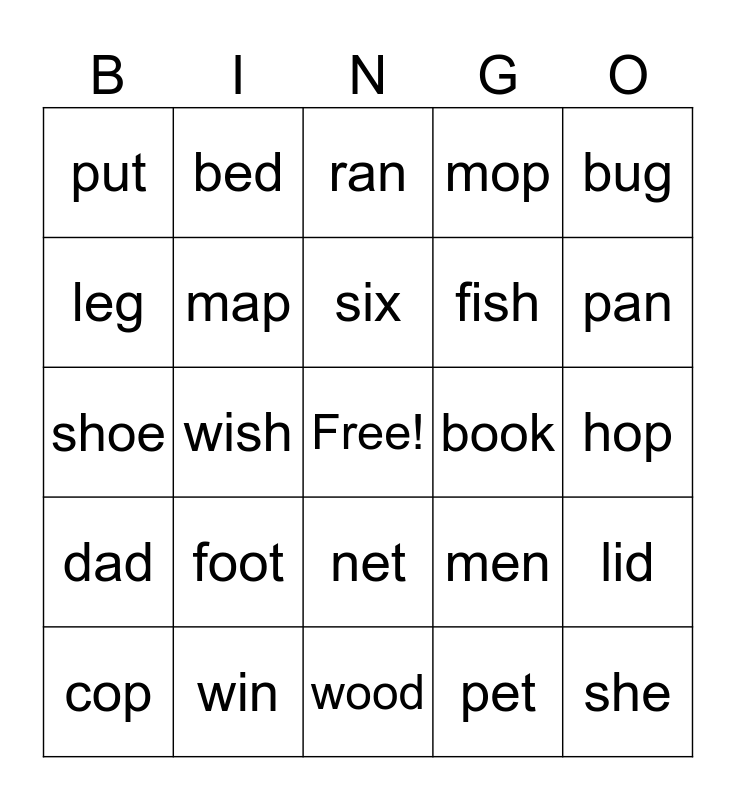 This bingo card has a free space and 24 words: cop, foot, six, pet, bug, put, bed, ran, book, hop, shoe, map, men, lid, leg, win, wood, mop, pan, dad, wish, net, fish and she.