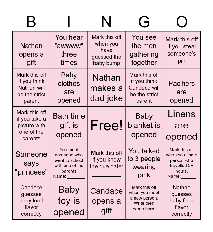This bingo card has a free space and 32 words: Mark this off when you meet a new person. Write their name here: ____________, You heard someone say "baby", Bath time gift is opened, Mark this off when you have decorated a block, Someone says "princess", Baby clothes are opened, Mark this off if you steal someone's pin, Mark this off when you find a person who travelled 2+ hours. Name:______, You hear "awwww" three times, Diapers are opened, Nathan makes a dad joke, Mark this off when you have guessed the baby bump, Mark this off when you know who made the desserts Name: _______, You accidentally said "baby", Baby blanket is opened, Four gifts have been opened, Candace guesses baby food flavor correctly, Mark this off if you take a picture with one of the parents, Mark this off if you know the due date: _________, You meet someone who went to school with one of the parents Name: _______, You talked to 3 people wearing pink, Feeding gear is opened, Linens are opened, Baby toy is opened, Nathan guesses baby food flavor correctly, You see the men gathering together, Mark this off if you think Candace will be the strict parent, Mark this off if you think Nathan will be the strict parent, Nathan opens a gift, Candace opens a gift, Guess the baby's name: _______ and Pacifiers are opened.