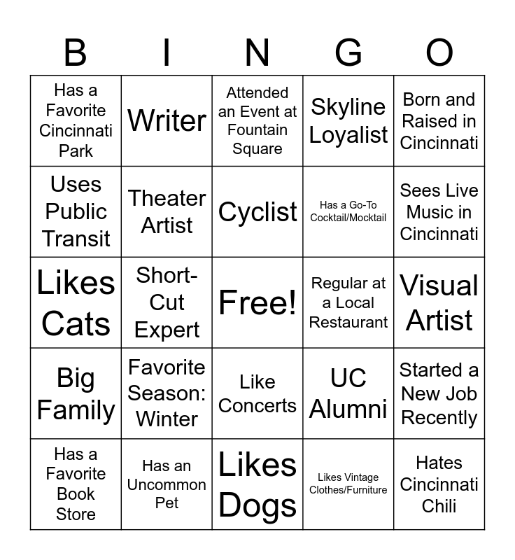 This bingo card has a free space and 74 words: Likes Art Museums & Exhibits, Likes to Ice Skate, Attended an Event at Fountain Square, Attended a Play at the Arnoff, Went to High School in Cincinnati, Likes Board Games, Likes Tabletop Role-Playing Games, Listens to Podcasts, Has a Favorite Book Store, Interested in Birdwatching, Runner, Regular at the Gym, Cyclist, Uses Public Transit, Has a Favorite Back Road in the Cincinnati Area, Short-Cut Expert, Goes to the Farmer's Market, Sees Live Music in Cincinnati, Enjoys Comedy Shows (Improv & Stand Up), Likes Cats, Theater Artist, Writer, Skyline Loyalist, Gold Star Loyalist, Hates Cincinnati Chili, Speaks Two or More Languages, Loves Interior Decorating, Keeps a Journal, First Time at the Playhouse, Subscriber for the 24-25 Season, Born and Raised in Cincinnati, Transplant to Cincinnati, Likes Video Games, Crafty, Likes to knit or crochet, Likes Vintage Clothes/Furniture, Likes to Cook/Bake, Bengals Fan, Reds Fan, Likes to Travel, Likes Dogs, Has an Uncommon Pet, Vegetarian, Likes to Dance, Likes to Sing Karaoke, Has a Favorite Cincinnati Park, FC Cincinnati Fan, Favorite Season: Winter, Favorite Season: Summer, Favorite Season: Spring, Favorite Season: Autumn, Plays a Sport, Visual Artist, Watches All the Oscar Movies, Plays an Instrument, Likes Horror Movies, Like Concerts, Has an Unpopular Favorite Pizza Topping, Travel Internationally, Started a New Job Recently, Has a Go-To Cocktail/Mocktail, Likes to Read, Big Family, Has a Go-To Coffee Beverage, Regular at a Local Restaurant, Likes Road Trips, Excited for Women's Soccer in Cincinnati, Cincinnati Cyclones Fan, UC Alumni, Xavier Alumni, NKU Alumni, Great at Math, Interested in History and Loves Nature.