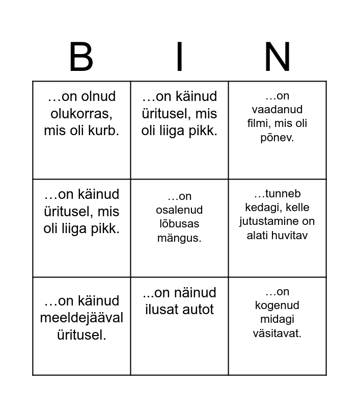 This bingo card has 9 words: …on käinud meeldejääval üritusel., …on osalenud lõbusas mängus., …on vaadanud filmi, mis oli põnev., …on olnud olukorras, mis oli kurb., …on käinud üritusel, mis oli liiga pikk., …tunneb kedagi, kelle jutustamine on alati huvitav, …on käinud üritusel, mis oli liiga pikk., ...on näinud ilusat autot and …on kogenud midagi väsitavat..