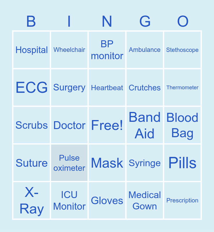This bingo card has a free space and 24 words: Pulse oximeter, ICU Monitor, Heartbeat, X-Ray, Stethoscope, Hospital, ECG, Wheelchair, Band Aid, Mask, Crutches, Scrubs, Syringe, Pills, Surgery, Medical Gown, Blood Bag, BP monitor, Thermometer, Doctor, Prescription, Suture, Ambulance and Gloves.