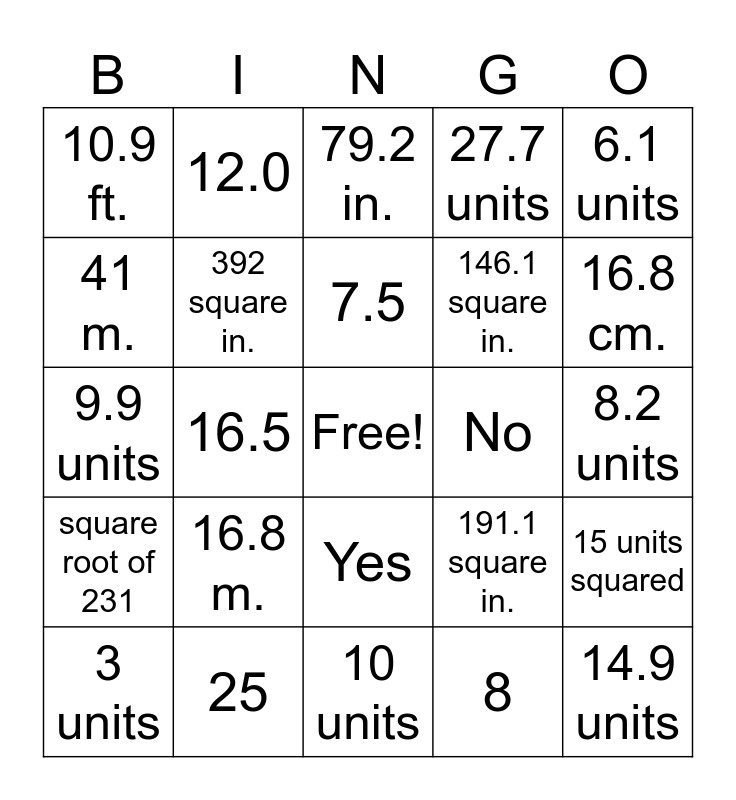 This bingo card has a free space and 30 words: 25, 24, 16.5, 22.9, 10.9 ft., 79.2 in., 392 square in., Yes, No, 10 units, 8.2 units, 14.9 units, 8, 1.5 in., 16.8 cm., 16.2 m., 191.1 square in., square root of 231, 16.8 m., 6.1 units, 9.9 units, 3.9 miles, 12.0, 146.1 square in., 41 m., 27.7 units, 15 units squared, 3 units, 7.5 and 9.