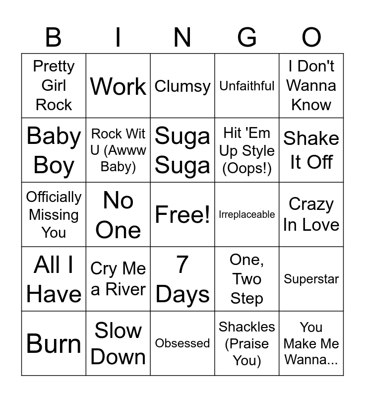 This bingo card has a free space and 40 words: Umbrella, Officially Missing You, Like You, Rock Wit U (Awww Baby), Slow Down, 7 Days, Suga Suga, Stickwitu, I Don't Wanna Know, All I Have, No One, Unfaithful, You Make Me Wanna..., Crazy In Love, Irreplaceable, Cry Me a River, Gimme That, Pretty Girl Rock, Big Girls Don't Cry (Personal), Clumsy, Superstar, Shackles (Praise You), Hit 'Em Up Style (Oops!), Baby Boy, Love Don't Cost a Thing, Jenny from the Block, Location, Fallin', U-Turn, What's Luv?, Apologize, Burn, No Diggity, One, Two Step, Shake It Off, Obsessed, It's Like That, Dilemma, Work and Case Of The Ex (Whatcha Gonna Do).
