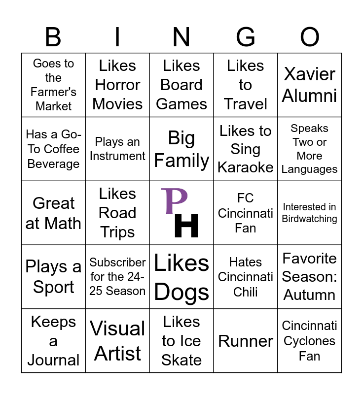 This bingo card has a free space and 75 words: Attended a Play at the Arnoff, Went to High School in Cincinnati, Likes Board Games, Likes Tabletop Role-Playing Games, Listens to Podcasts, Has a Favorite Book Store, Like Concerts, Has an Unpopular Favorite Pizza Topping, Travel Internationally, Started a New Job Recently, Has a Go-To Cocktail/Mocktail, Likes to Read, Big Family, Has a Go-To Coffee Beverage, Regular at a Local Restaurant, Likes Road Trips, Excited for Women's Soccer in Cincinnati, Cincinnati Cyclones Fan, UC Alumni, Xavier Alumni, NKU Alumni, Great at Math, Plays an Instrument, Likes Horror Movies, Likes to Travel, Likes to Bake, Likes to Dance, Likes Art Museums & Exhibits, Short-Cut Expert, Theater Artist, Writer, Skyline Loyalist, Gold Star Loyalist, Hates Cincinnati Chili, Speaks Two or More Languages, Likes to Sing Karaoke, Interested in History, Loves Nature, Interested in Birdwatching, Runner, Regular at the Gym, Cyclist, Uses Public Transit, Has a Favorite Back Road in the Cincinnati Area, Has a Favorite Cincinnati Park, Loves Interior Decorating, Keeps a Journal, Goes to the Farmer's Market, Sees Live Music in Cincinnati, Enjoys Comedy Shows (Improv & Stand Up), Likes Cats, Likes Dogs, Has an Uncommon Pet, Vegetarian, Likes Video Games, Crafty, Likes Knitting, Likes Vintage Clothes/Furniture, Likes to Cook/Bake, First Time at the Playhouse, Subscriber for the 24-25 Season, Born and Raised in Cincinnati, Transplant to Cincinnati, Bengals Fan, Reds Fan, FC Cincinnati Fan, Favorite Season: Winter, Favorite Season: Summer, Favorite Season: Spring, Favorite Season: Autumn, Plays a Sport, Visual Artist, Watches All the Oscar Movies, Likes to Ice Skate and Attended an Event at Fountain Square.