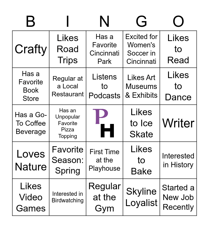 This bingo card has a free space and 75 words: Uses Public Transit, Has a Favorite Back Road in the Cincinnati Area, Has a Favorite Cincinnati Park, Loves Interior Decorating, Keeps a Journal, Goes to the Farmer's Market, Sees Live Music in Cincinnati, Enjoys Comedy Shows (Improv & Stand Up), Attended a Play at the Arnoff, Went to High School in Cincinnati, Likes Board Games, Likes Tabletop Role-Playing Games, Listens to Podcasts, Has a Favorite Book Store, Like Concerts, Has an Unpopular Favorite Pizza Topping, Travel Internationally, Started a New Job Recently, Has a Go-To Cocktail/Mocktail, Likes to Read, Big Family, Has a Go-To Coffee Beverage, Regular at a Local Restaurant, Likes Road Trips, Excited for Women's Soccer in Cincinnati, Cincinnati Cyclones Fan, UC Alumni, Xavier Alumni, NKU Alumni, Great at Math, Plays an Instrument, Likes Horror Movies, Likes to Travel, Likes to Bake, Likes to Dance, Likes Art Museums & Exhibits, Short-Cut Expert, Theater Artist, Writer, Skyline Loyalist, Gold Star Loyalist, Hates Cincinnati Chili, Likes Cats, Likes Dogs, Has an Uncommon Pet, Vegetarian, Likes Video Games, Crafty, Likes Knitting, Likes Vintage Clothes/Furniture, Likes to Cook/Bake, First Time at the Playhouse, Subscriber for the 24-25 Season, Born and Raised in Cincinnati, Transplant to Cincinnati, Bengals Fan, Reds Fan, FC Cincinnati Fan, Favorite Season: Winter, Favorite Season: Summer, Favorite Season: Spring, Favorite Season: Autumn, Plays a Sport, Visual Artist, Watches All the Oscar Movies, Likes to Ice Skate, Attended an Event at Fountain Square, Speaks Two or More Languages, Likes to Sing Karaoke, Interested in History, Loves Nature, Interested in Birdwatching, Runner, Regular at the Gym and Cyclist.