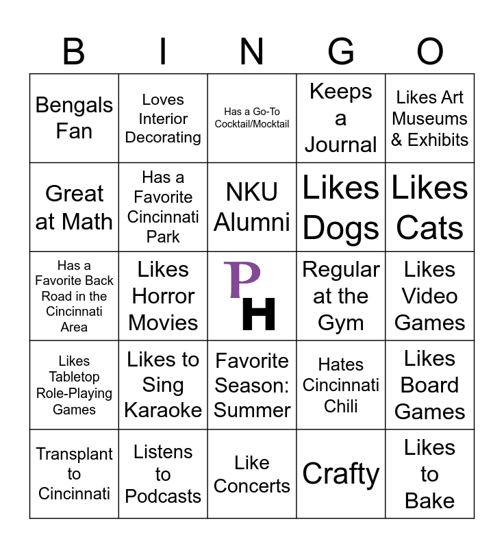 This bingo card has a free space and 75 words: Travel Internationally, Started a New Job Recently, Has a Go-To Cocktail/Mocktail, Likes to Read, Big Family, Has a Go-To Coffee Beverage, Regular at a Local Restaurant, Likes Road Trips, Excited for Women's Soccer in Cincinnati, Cincinnati Cyclones Fan, UC Alumni, Xavier Alumni, NKU Alumni, Great at Math, Plays an Instrument, Likes Horror Movies, Likes to Travel, Likes to Bake, Likes to Dance, Likes Art Museums & Exhibits, Uses Public Transit, Has a Favorite Back Road in the Cincinnati Area, Has a Favorite Cincinnati Park, Loves Interior Decorating, Keeps a Journal, Goes to the Farmer's Market, Sees Live Music in Cincinnati, Enjoys Comedy Shows (Improv & Stand Up), Short-Cut Expert, Theater Artist, Writer, Skyline Loyalist, Gold Star Loyalist, Hates Cincinnati Chili, Likes Cats, Likes Dogs, Has an Uncommon Pet, Vegetarian, Likes Video Games, Crafty, Likes Knitting, Likes Vintage Clothes/Furniture, Likes to Cook/Bake, First Time at the Playhouse, Subscriber for the 24-25 Season, Born and Raised in Cincinnati, Transplant to Cincinnati, Bengals Fan, Reds Fan, FC Cincinnati Fan, Favorite Season: Winter, Favorite Season: Summer, Favorite Season: Spring, Favorite Season: Autumn, Plays a Sport, Visual Artist, Watches All the Oscar Movies, Likes to Ice Skate, Attended an Event at Fountain Square, Speaks Two or More Languages, Likes to Sing Karaoke, Interested in History, Loves Nature, Interested in Birdwatching, Runner, Regular at the Gym, Cyclist, Attended a Play at the Arnoff, Went to High School in Cincinnati, Likes Board Games, Likes Tabletop Role-Playing Games, Listens to Podcasts, Has a Favorite Book Store, Like Concerts and Has an Unpopular Favorite Pizza Topping.
