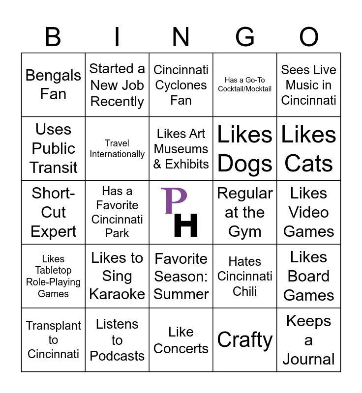 This bingo card has a free space and 75 words: Likes Road Trips, Excited for Women's Soccer in Cincinnati, Cincinnati Cyclones Fan, UC Alumni, Xavier Alumni, NKU Alumni, Great at Math, Plays an Instrument, Likes Horror Movies, Likes to Travel, Likes to Bake, Likes to Dance, Likes Art Museums & Exhibits, Uses Public Transit, Has a Favorite Back Road in the Cincinnati Area, Has a Favorite Cincinnati Park, Loves Interior Decorating, Keeps a Journal, Goes to the Farmer's Market, Sees Live Music in Cincinnati, Enjoys Comedy Shows (Improv & Stand Up), Short-Cut Expert, Travel Internationally, Started a New Job Recently, Has a Go-To Cocktail/Mocktail, Likes to Read, Big Family, Has a Go-To Coffee Beverage, Regular at a Local Restaurant, Theater Artist, Writer, Skyline Loyalist, Gold Star Loyalist, Hates Cincinnati Chili, Likes Cats, Likes Dogs, Has an Uncommon Pet, Vegetarian, Likes Video Games, Crafty, Likes Knitting, Likes Vintage Clothes/Furniture, Likes to Cook/Bake, First Time at the Playhouse, Subscriber for the 24-25 Season, Born and Raised in Cincinnati, Transplant to Cincinnati, Bengals Fan, Reds Fan, FC Cincinnati Fan, Favorite Season: Winter, Favorite Season: Summer, Favorite Season: Spring, Favorite Season: Autumn, Plays a Sport, Visual Artist, Watches All the Oscar Movies, Likes to Ice Skate, Attended an Event at Fountain Square, Speaks Two or More Languages, Likes to Sing Karaoke, Interested in History, Loves Nature, Interested in Birdwatching, Runner, Regular at the Gym, Cyclist, Attended a Play at the Arnoff, Went to High School in Cincinnati, Likes Board Games, Likes Tabletop Role-Playing Games, Listens to Podcasts, Has a Favorite Book Store, Like Concerts and Has an Unpopular Favorite Pizza Topping.
