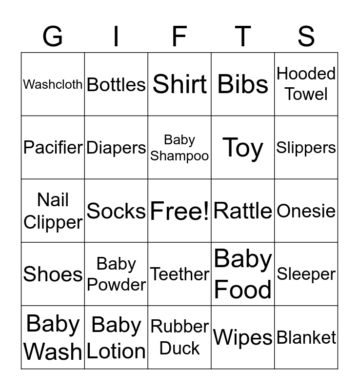 This bingo card has a free space and 24 words: Baby Powder, Baby Lotion, Baby Shampoo, Baby Wash, Hooded Towel, Washcloth, Pacifier, Bottles, Rattle, Teether, Toy, Nail Clipper, Baby Food, Sleeper, Diapers, Wipes, Onesie, Shirt, Slippers, Socks, Blanket, Shoes, Bibs and Rubber Duck.