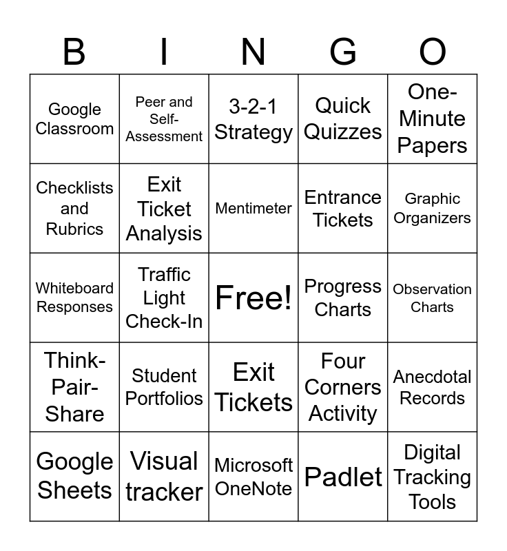 This bingo card has a free space and 29 words: Google Sheets, One-Sentence Summary, Traffic Light Check-In, Microsoft Forms, Google Classroom, 3-2-1 Strategy, Exit Ticket Analysis, Student Portfolios, Progress Charts, Visual tracker, Observation Charts, Digital Tracking Tools, Microsoft OneNote, Padlet, Graphic Organizers, Quizzes & Polls, Exit Tickets, Think-Pair-Share, One-Minute Papers, Whiteboard Responses, Four Corners Activity, Journaling & Reflection Logs, Entrance Tickets, Checklists and Rubrics, Quick Quizzes, Peer and Self-Assessment, Anecdotal Records, Mentimeter and Kahoot.