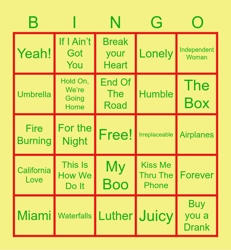 This bingo card has a free space and 24 words: This Is How We Do It, Waterfalls, End Of The Road, Miami, Independent Woman, Yeah!, Umbrella, If I Ain’t Got You, Irreplaceable, My Boo, Humble, Fire Burning, Kiss Me Thru The Phone, Forever, Hold On, We’re Going Home, Juicy, Airplanes, Break your Heart, The Box, For the Night, Buy you a Drank, California Love, Lonely and Luther.