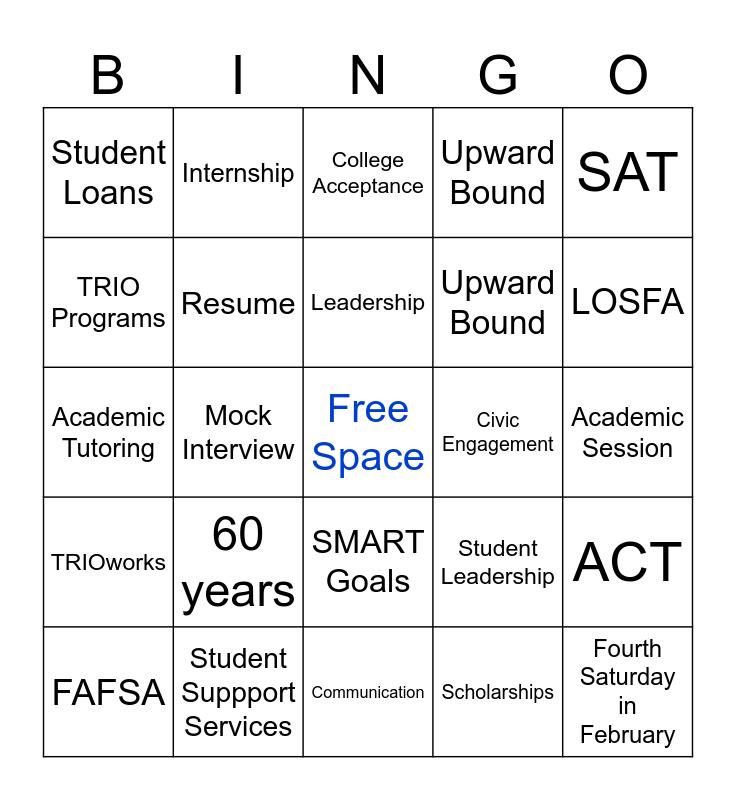 This bingo card has a free space and 34 words: Advocate, Work-Study, First-Generation College Celebration Day, Summer Component, Academic Session, TRIO Programs, Resume, Communication, Upward Bound, Fourth Saturday in February, Academic Tutoring, Internship, Scholarships, TOPS, TRIOworks, Mock Interview, SMART Goals, Civic Engagement, ACT, FAFSA, Student Suppport Services, Cultural Diversity, Upward Bound, LOSFA, COE, 60 years, College Acceptance, Admissions, SAT, Student Loans, Resources, Leadership, Student Leadership and Finances.