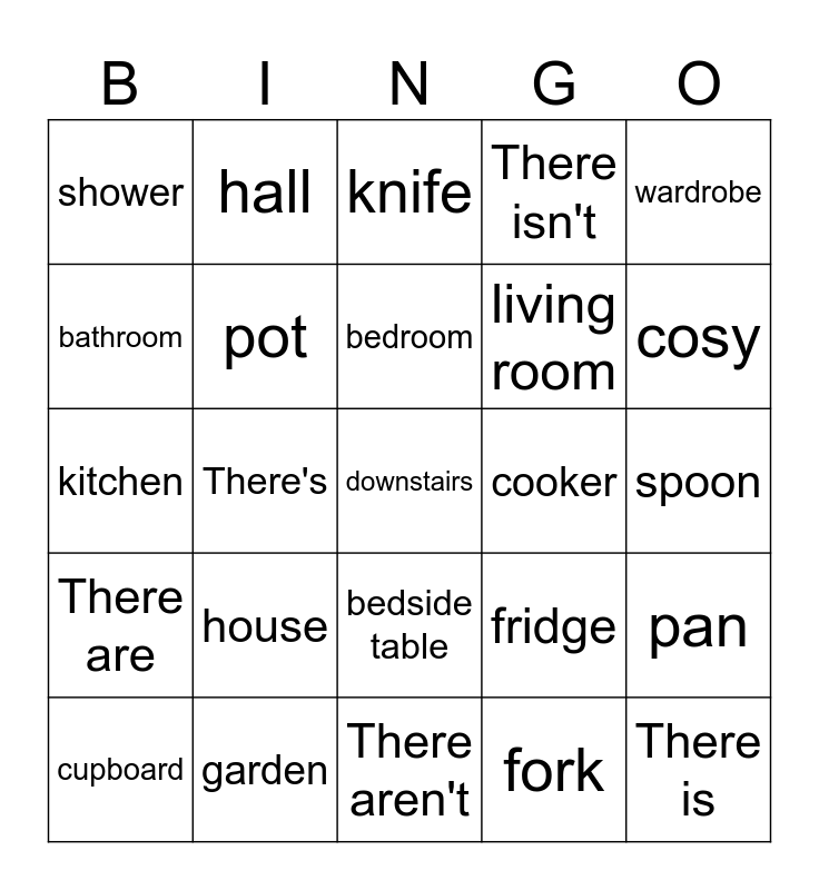 This bingo card has a free space and 24 words: house, garden, bedroom, cupboard, wardrobe, shower, bathroom, hall, cooker, bedside table, living room, kitchen, fridge, pan, pot, fork, spoon, knife, cosy, There's, There is, There are, There isn't and There aren't.