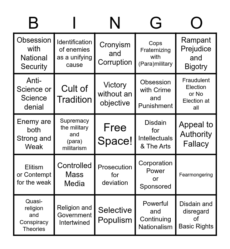 This bingo card has a free space and 24 words: Controlled Mass Media, Religion and Government Intertwined, Victory without an objective, Quasi-religion and Conspiracy Theories, Rampant Prejudice and Bigotry, Obsession with National Security, Anti-Science or Science denial, Identification of enemies as a unifying cause, Disdain for Intellectuals & The Arts, Prosecution for deviation, Obsession with Crime and Punishment, Enemy are both Strong and Weak, Corporation Power or Sponsored, Fearmongering, Cult of Tradition, Powerful and Continuing Nationalism, Appeal to Authority Fallacy, Cronyism and Corruption, Fraudulent Election or No Election at all, Supremacy the military and (para) militarism, Disdain and disregard of Basic Rights, Elitism or Contempt for the weak, Cops Fraternizing with (Para)military and Selective Populism.