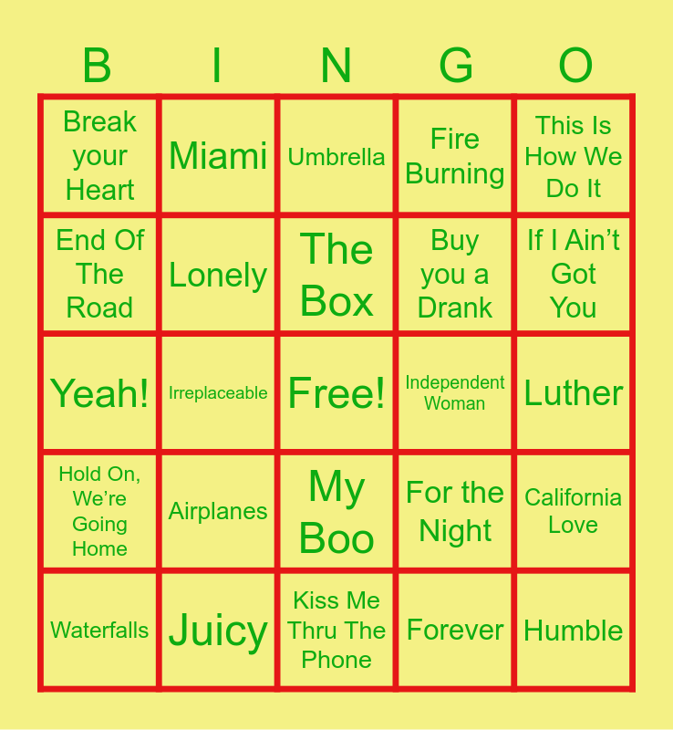 This bingo card has a free space and 24 words: Airplanes, Juicy, The Box, Waterfalls, This Is How We Do It, Break your Heart, End Of The Road, Miami, Independent Woman, My Boo, Buy you a Drank, Yeah!, For the Night, California Love, Lonely, Forever, Luther, Umbrella, If I Ain’t Got You, Irreplaceable, Humble, Hold On, We’re Going Home, Fire Burning and Kiss Me Thru The Phone.