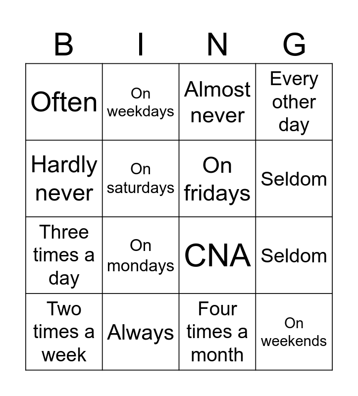 This bingo card has 21 words: Always, Sometimes, On weekdays, Never, Four times a month, On fridays, Often, Almost never, CNA, Seldom, Three times a day, Every other day, On weekends, Every day, On saturdays, Usually, Two times a week, On mondays, Hardly never, Seldom and Rarely.
