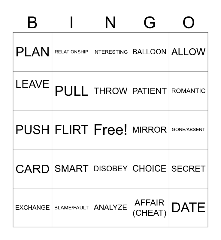 This bingo card has a free space and 74 words: SWEETHEART, UPSET, INTERESTING, DREAM, TRADE, REPLACE, GIFT, ROSE, EXCHANGE, SANDWICH, CHIPS, THROW-AWAY, THROW, LEAVE, GO-OUT, FLIRT, REFUSE, ROMANTIC, COMPARE, PUSH, PULL, RELATIONSHIP, BALLOON, FALL-IN-LOVE, DATE, RESPECT, PREFER, FREE, PRISON, THERAPY, ALLOW, PERMISSION, STRICT, STEAL, CHEAT(TEST), AFFAIR (CHEAT), HOPE, LECTURE, SAFE, RESPONSIBLE, ANALYZE, BLAME/FAULT, MAYBE, THEIF, CONFLICT, PLAN, ORGANIZE, SMART, APPEAR, DISAPPEAR, ALRIGHT, STUCK, GONE/ABSENT, OPINION, REQUIRE, OBEY, DISOBEY, HIDE, SUFFER, SECRET, PATIENT, SHY, CARD, FACETIME, MIRROR, IMPORTANT, ANSWER, STORY, CHOICE, ENCOURAGE, CAUGHT, JANITOR, GIVE-UP and OPPORTUNITY.