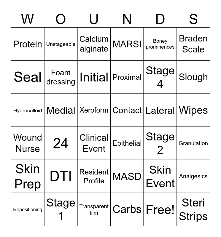 This bingo card has 42 words: Free!, Foam dressing, Serosanguinous, Lateral, Granulation, 24, Hydrocolloid, Eschar, Calcium alginate, Wipes, Xeroform, Proximal, Slough, Boney prominences, Stage 1, Wound Nurse, Analgesics, Stage 4, Steri Strips, Unstageable, Braden Scale, Resident Profile, Skin Prep, Protein, Stage 3, Repositioning, Initial, EBP, DTI, Skin Event, Wound Bed, Contact, Seal, Stage 2, Transparent film, Clinical Event, Epithelial, Medial, MASD, Carbs, MARSI and Progress note.