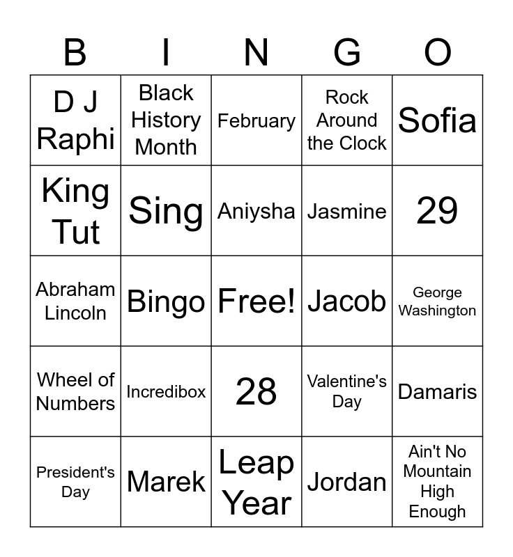 This bingo card has a free space and 24 words: Incredibox, Marek, Aniysha, President's Day, Sofia, D J Raphi, King Tut, Black History Month, Jacob, 28, Jasmine, Abraham Lincoln, Valentine's Day, Damaris, Sing, Jordan, George Washington, February, 29, Bingo, Ain't No Mountain High Enough, Wheel of Numbers, Rock Around the Clock and Leap Year.
