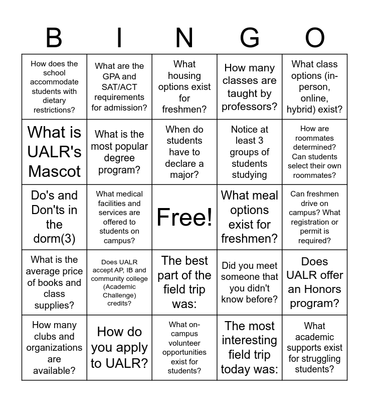 This bingo card has a free space and 38 words: What is the average student enrollment?, What safety measures exist on the campus?, What internships are available and/or required?, What is the most popular degree program?, Does UALR offer an Honors program?, Does UALR accept AP, IB and community college (Academic Challenge) credits?, When do students have to declare a major?, Do students receive academic advisors?, What class options (in-person, online, hybrid) exist?, Notice at least 3 groups of students studying, What medical facilities and services are offered to students on campus?, How many classes are taught by professors?, What academic supports exist for struggling students?, Can freshmen drive on campus? What registration or permit is required?, What is UALR's Mascot, What is the average price of books and class supplies?, What is the average price of room and board?, What housing options exist for freshmen?, Do freshmen need to live on campus?, What meal options exist for freshmen?, How does the school accommodate students with dietary restrictions?, How do you apply to UALR?, How are roommates determined? Can students select their own roommates?, How many clubs and organizations are available?, What are the most popular on-campus events?, What on-campus volunteer opportunities exist for students?, What sports are offered (competitive, intramural, etc.)?, What fitness centers (gyms, pools, tracks, etc.) are available on campus?, What religious affiliations are represented in the school community?, What public transportation is available on or near the campus?, What technology support is offered to students on campus?, The best part of the field trip was:, The most interesting field trip today was:, What are the GPA and SAT/ACT requirements for admission?, Something that really surprised me was:, Did you meet someone that you didn't know before?, Do's and Don'ts in the dorm(3) and What types of scholarships are available?.