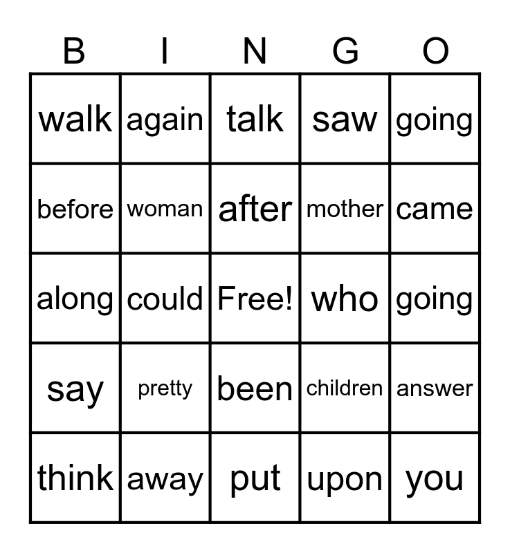 This bingo card has a free space and 24 words: pretty, away, after, think, going, walk, before, again, who, been, mother, along, children, answer, woman, upon, going, talk, came, could, you, say, saw and put.