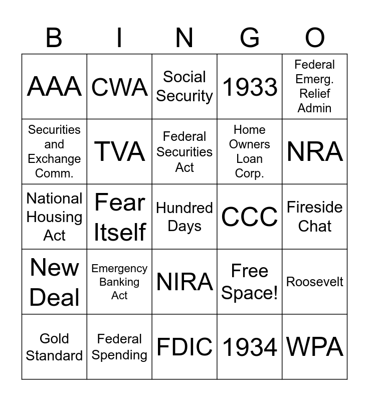 This bingo card has 25 words: Emergency Banking Act, FDIC, Federal Securities Act, Gold Standard, Federal Emerg. Relief Admin, AAA, Securities and Exchange Comm., CWA, CCC, NIRA, Home Owners Loan Corp., National Housing Act, Free Space!, Roosevelt, TVA, WPA, Fireside Chat, Social Security, NRA, Fear Itself, Hundred Days, Federal Spending, New Deal, 1933 and 1934.
