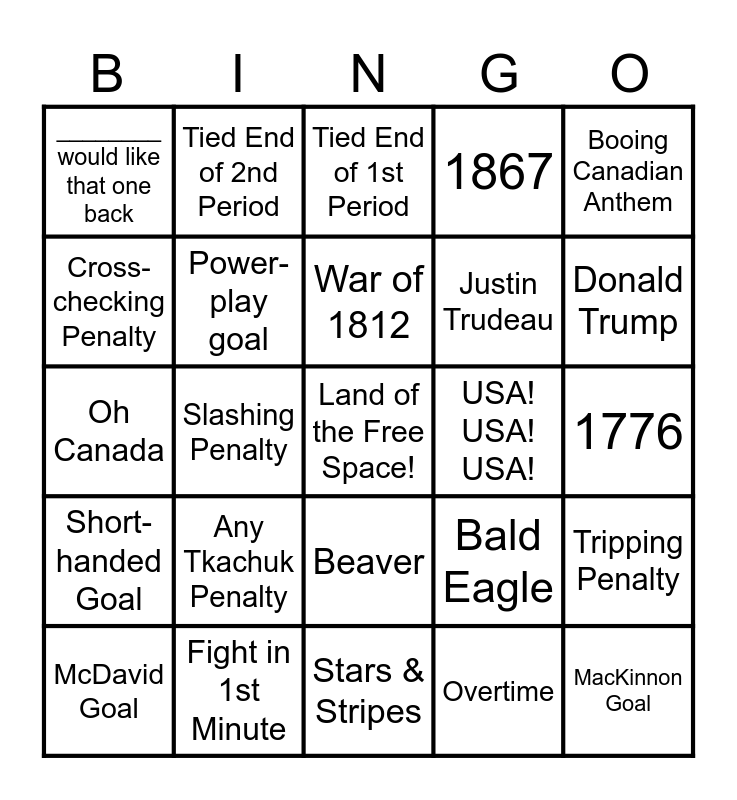 This bingo card has a free space and 24 words: Any Tkachuk Penalty, Fight in 1st Minute, War of 1812, McDavid Goal, Booing Canadian Anthem, ________ would like that one back, Cross-checking Penalty, Tied End of 2nd Period, USA! USA! USA!, Beaver, Justin Trudeau, Oh Canada, Bald Eagle, Tripping Penalty, Power-play goal, Overtime, 1776, Tied End of 1st Period, Donald Trump, Slashing Penalty, MacKinnon Goal, Short-handed Goal, 1867 and Stars & Stripes.