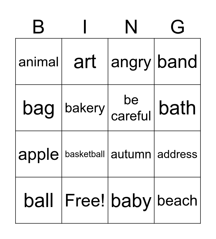 This bingo card has 16 words: Free!, address, angry, animal, apple, art, autumn, baby, bag, bakery, ball, band, basketball, bath, be careful and beach.