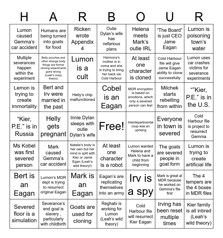 This bingo card has a free space and 48 words: Ms Kobel was first severed person, Helly gets pregnant, Goats are used for cloning, At least one character is a robot, At least one character is cloned, Everyone in town is severed, Lumon is poisoning town’s water, Severed floor is a simulation, Bert and Irv were married in the past, Innie Dylan sleeps with outie Dylan’s wife, Outie Dylan’s wife has nefarious plans, Helena meets Mark’s outie IRL, Milchek starts rebelling from within, “”Kier, P.E.” is in the U.S., “Kier, P.E.” is in Russia, Lumon’s MDR dept is trying to resurrect original Eagan, Ricken wrote Appendix 4, Cobel is an Eagan, Irv is a spy, “The Board” is just CEO Jame Eagan, Lumon uses car crashes victims for severance experiments, Multiple severances happen within the experiment, Humans are being turned into goats for food, Lumon is a cult, Cold Harbour file will resurrect Kier Eagan, Cold Harbour file will give Jame Eagan ability to clone successfully, Cold Harbour file is project to resurrect Gemma, Bert is an Eagan, Mark caused Gemma’s car accident, Helly’s chip malfunctioned, Eagan’s are replicating themselves into an army, MDR encryption is based on emotions, which only a severed person can feel, Mark is great at MDR because he worked on Gemma’s file first, The 4 tempers are the 4 boxes in MDR files, Lumon caused Gemma’s car accident, Severance’s end goal is slavery , particularly with childbirth, Natalie’s body is her own but her mind is split with Kier or Jame Egan (Leah’s wild theory!), Reghabi is working for Lumon (Leah’s wild theory), Interdepartmental coup was an uprising, Irving has been reset multiple times, Lumon is trying to create artificial life, Lemon is trying to create immortality, Belly pouches and other strange body things are former cloning experiments gone wrong (Leah’s crazy theory), Mark is an Eagan, Harmony’s mother is in coma and she is trying to bring her back via Cold Harbour, Lumon wanted Helena and Mark to have a child from beginning, The goats are severed people in goat form and Kier family is all inbred (Leah’s wild theory).