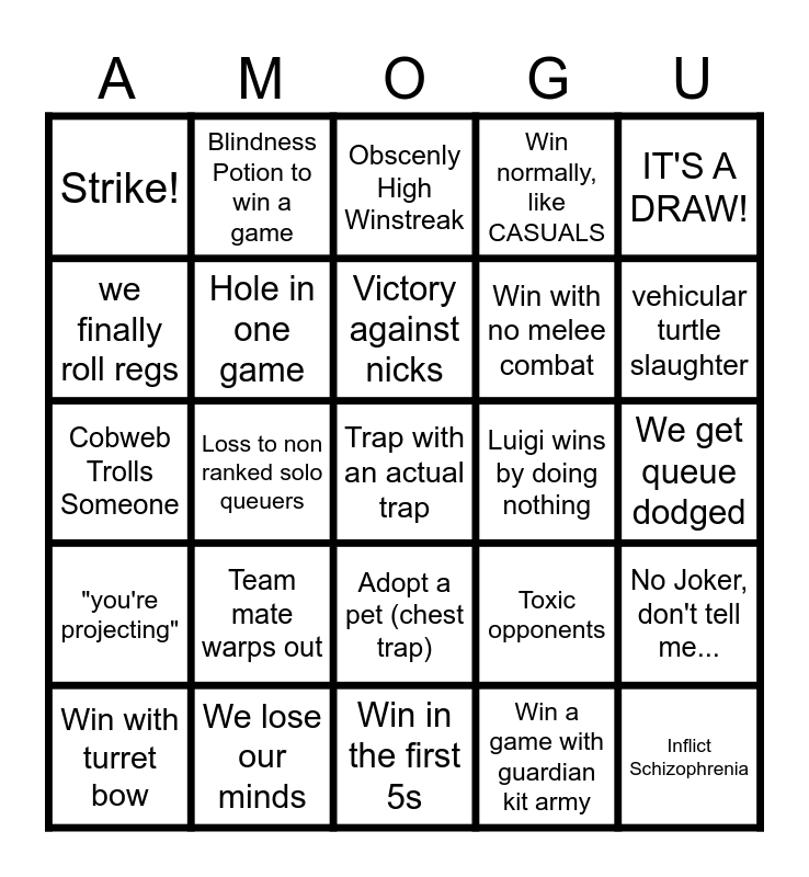 This bingo card has 47 words: Elden Ring Style Back stab, Trap with an actual trap, Blocktrap someone, Win in the first 5s, Team mate warps out, Both of us walk off the map, Blindness Potion to win a game, Bowspam someone to death, we finally roll regs, Skybase on meteor, Hole in one game, Win normally, like CASUALS, No Joker, don't tell me..., Toxic opponents, Sussy Emily133, Curse of 13 Winstreak, Victory against nicks, Luigi wins by doing nothing, Kill someone with lava, IT'S A DRAW!, Loss to non ranked solo queuers, Win a game with guardian kit army, Strike!, Win with no melee combat, Team troll eachother, vehicular turtle slaughter, Win with turret bow, Zookeeper army victory, Adopt a pet (chest trap), "you're projecting", Low intelligence specimen, Opponent is gullible, Cactus kit victory, Spleef somebody, Find the truth in front of us, We lose our minds, We get queue dodged, Funny auto GG message, Skill Issue, Uno Reverse Card, Inflict Schizophrenia, Obscenly High Winstreak, Cobweb Trolls Someone, Drown somebody, Swamp Island Bridge, Win with LSD and Win with W unbound.