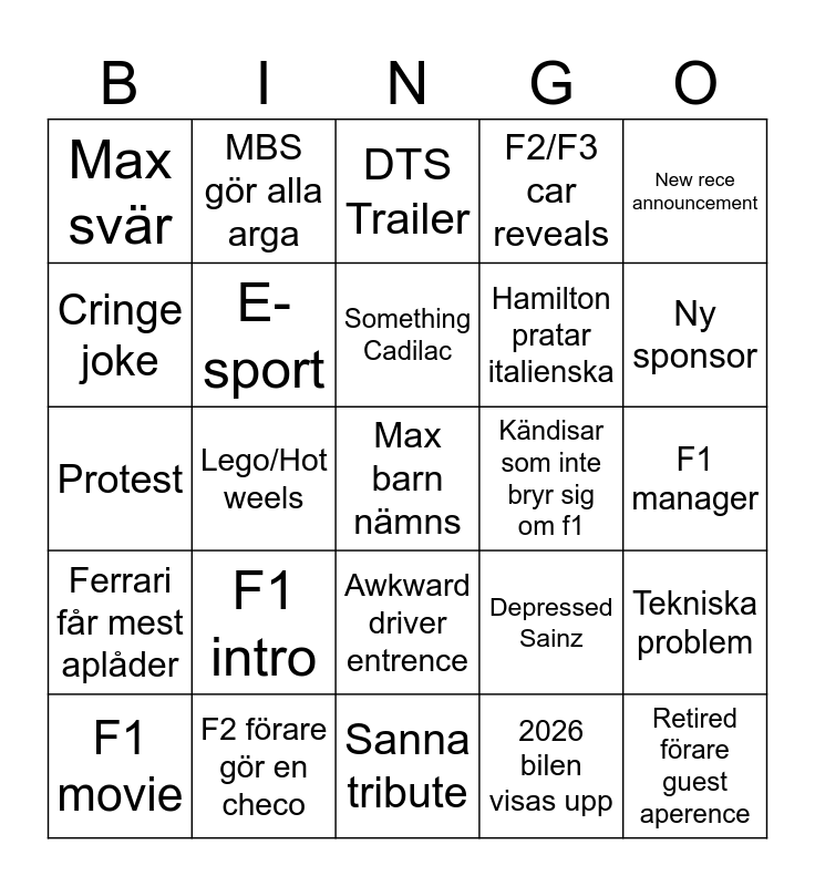 This bingo card has 25 words: F1 intro, Sanna tribute, Something Cadilac, F1 movie, New rece announcement, Max svär, Cringe joke, MBS gör alla arga, Kändisar som inte bryr sig om f1, Awkward driver entrence, Hamilton pratar italienska, Protest, Depressed Sainz, Tekniska problem, E-sport, Retired förare guest aperence, F1 manager, DTS Trailer, Ny sponsor, Lego/Hot weels, Max barn nämns, F2 förare gör en checo, Ferrari får mest aplåder, F2/F3 car reveals and 2026 bilen visas upp.