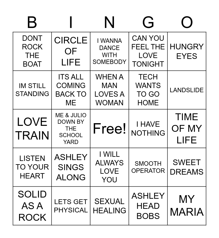 This bingo card has a free space and 29 words: SOLID AS A ROCK, AFRICA, ME & JULIO DOWN BY THE SCHOOL YARD, DONT STOP BELIEVING, DONT ROCK THE BOAT, I WANNA DANCE WITH SOMEBODY, ITS ALL COMING BACK TO ME, ASHLEY SINGS ALONG, I HAVE NOTHING, LETS GET PHYSICAL, TIME OF MY LIFE, MY MARIA, SEXUAL HEALING, ASHLEY HEAD BOBS, LANDSLIDE, ISLANDS IN THE STREAM, I WILL ALWAYS LOVE YOU, LISTEN TO YOUR HEART, HUNGRY EYES, LOVE TRAIN, SMOOTH OPERATOR, MY HEART WILL GO ON, TECH WANTS TO GO HOME, IM STILL STANDING, CAN YOU FEEL THE LOVE TONIGHT, CIRCLE OF LIFE, SWEET DREAMS, WHEN A MAN LOVES A WOMAN and I HAVE NOTHING.