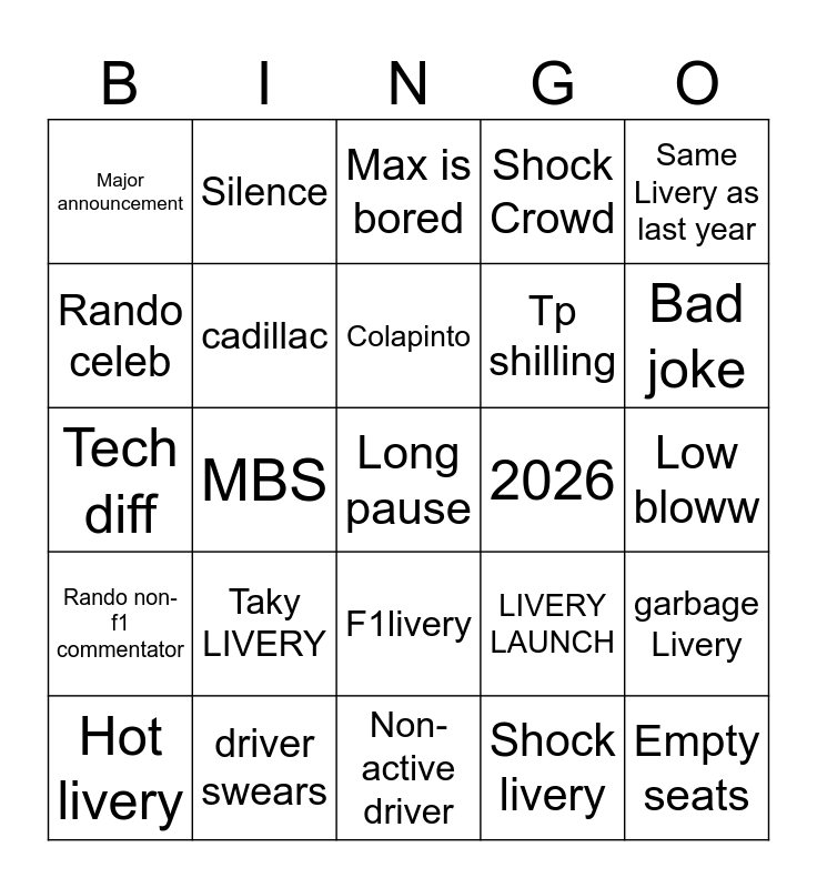 This bingo card has 25 words: Taky LIVERY, Non-active driver, Colapinto, Hot livery, Same Livery as last year, Major announcement, Rando celeb, Silence, 2026, F1livery, Tp shilling, Tech diff, LIVERY LAUNCH, garbage Livery, cadillac, Empty seats, Low bloww, Max is bored, Bad joke, MBS, Long pause, driver swears, Rando non-f1 commentator, Shock Crowd and Shock livery.